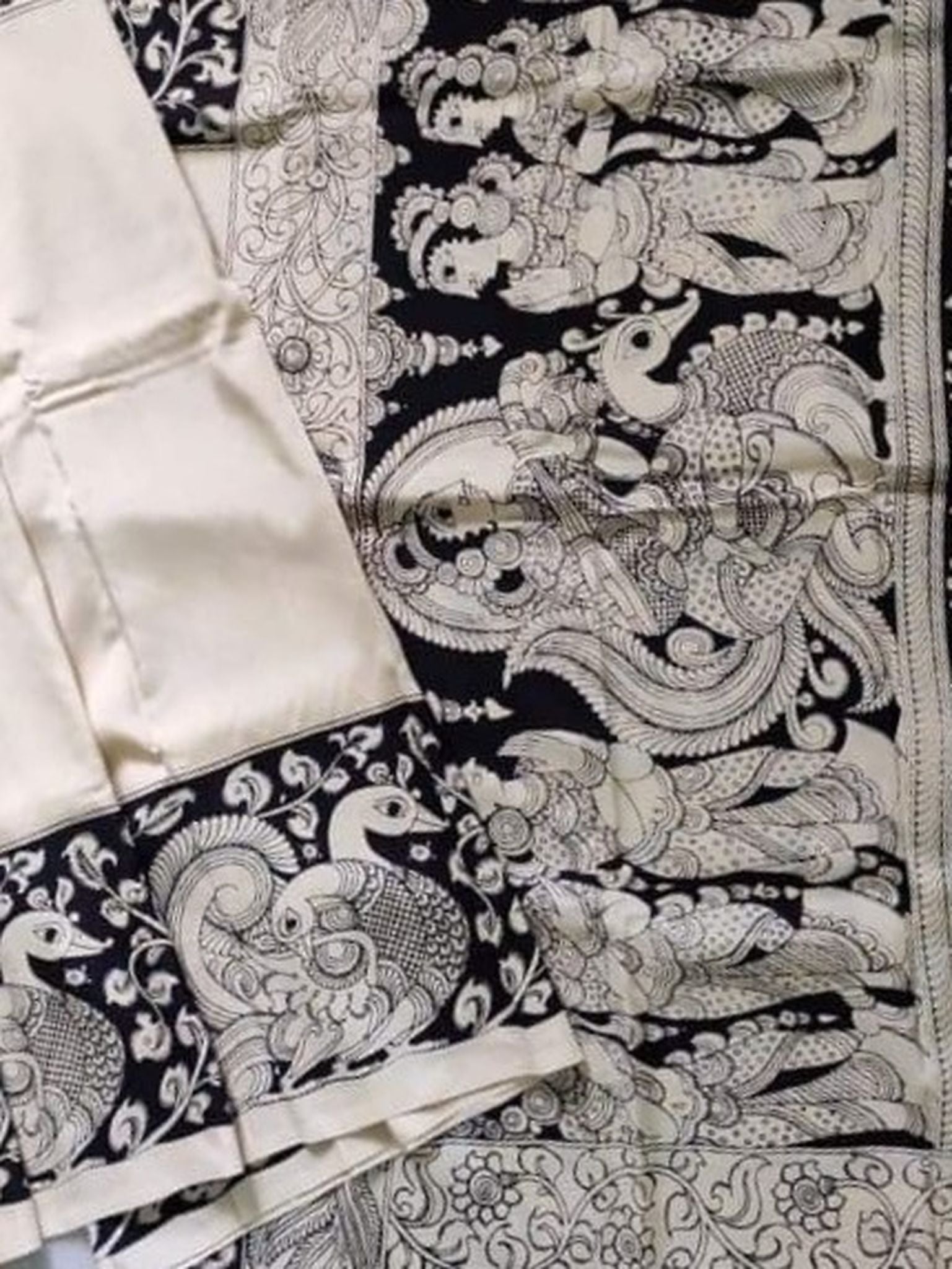 Kalamkari Chennuri Silk Black& white Hand Painted Sarees