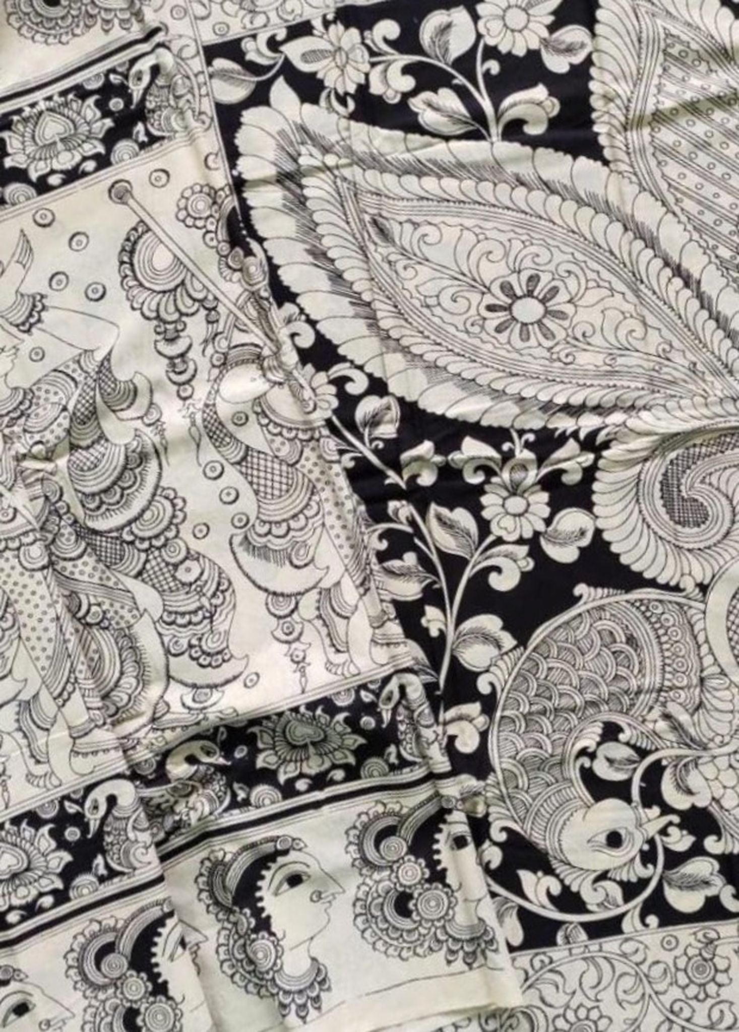 Kalamkari Chennuri Silk Black& white Hand Painted Sarees