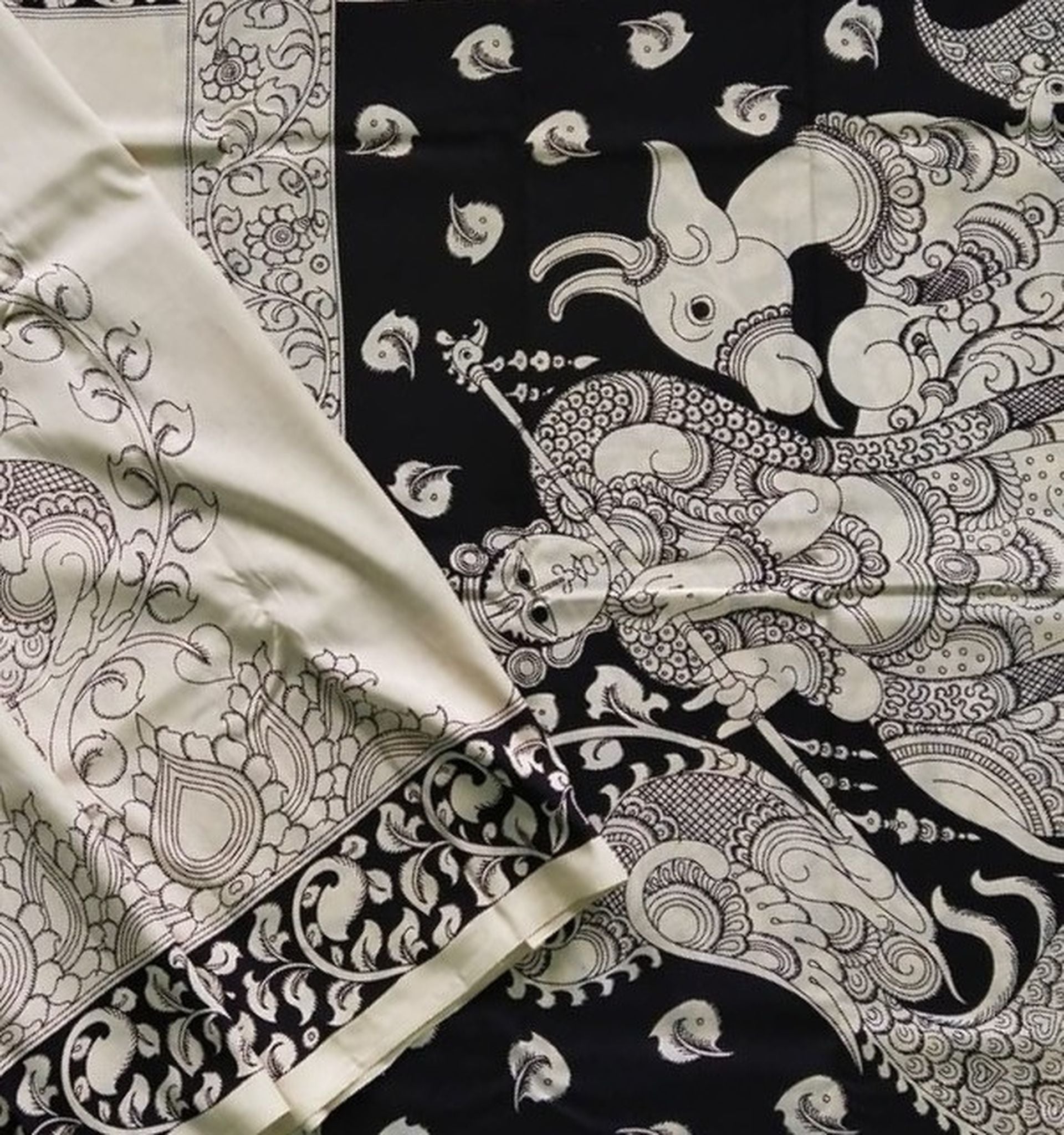 Kalamkari Chennuri Silk Black& white Hand Painted Sarees