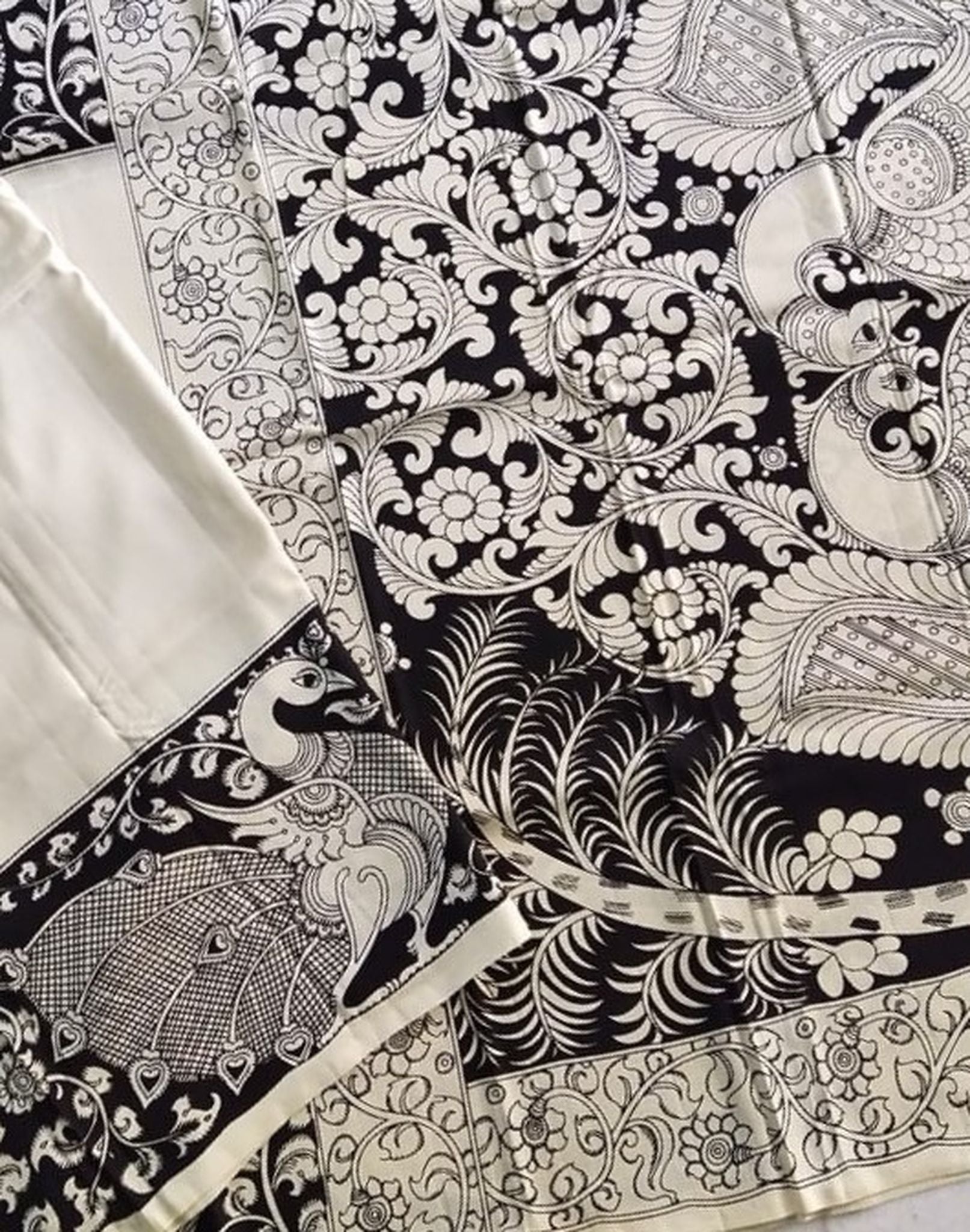 Kalamkari Chennuri Silk Black& white Hand Painted Sarees
