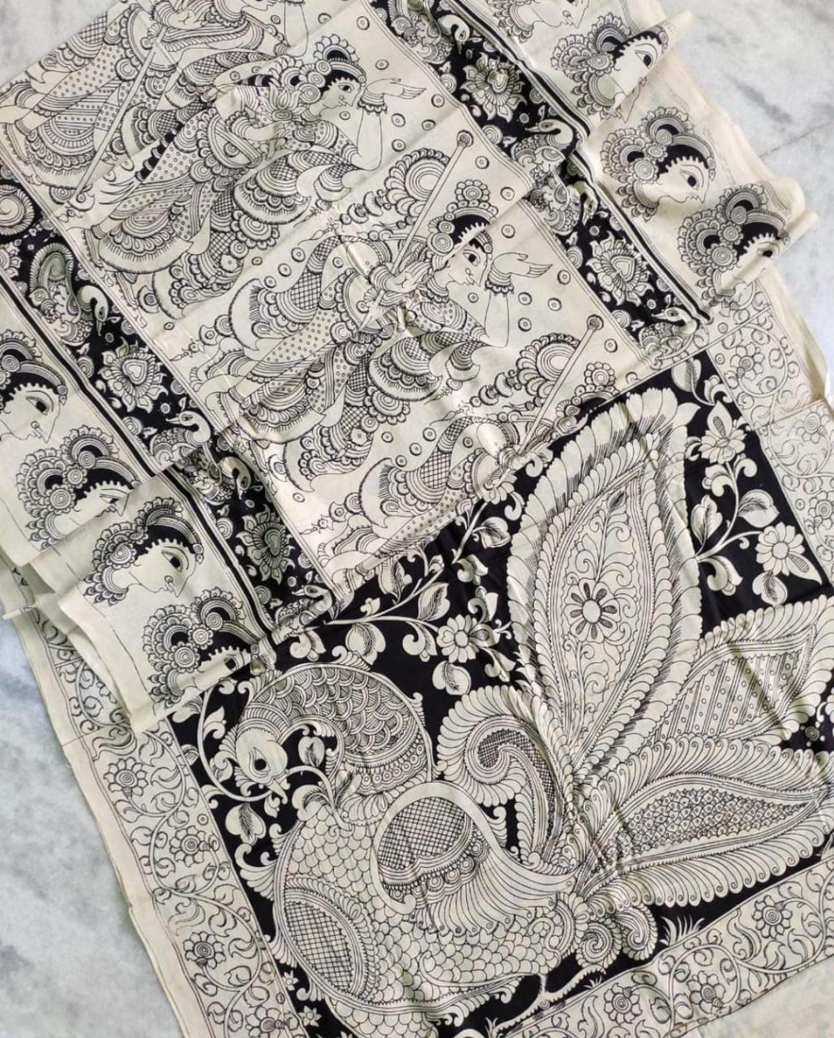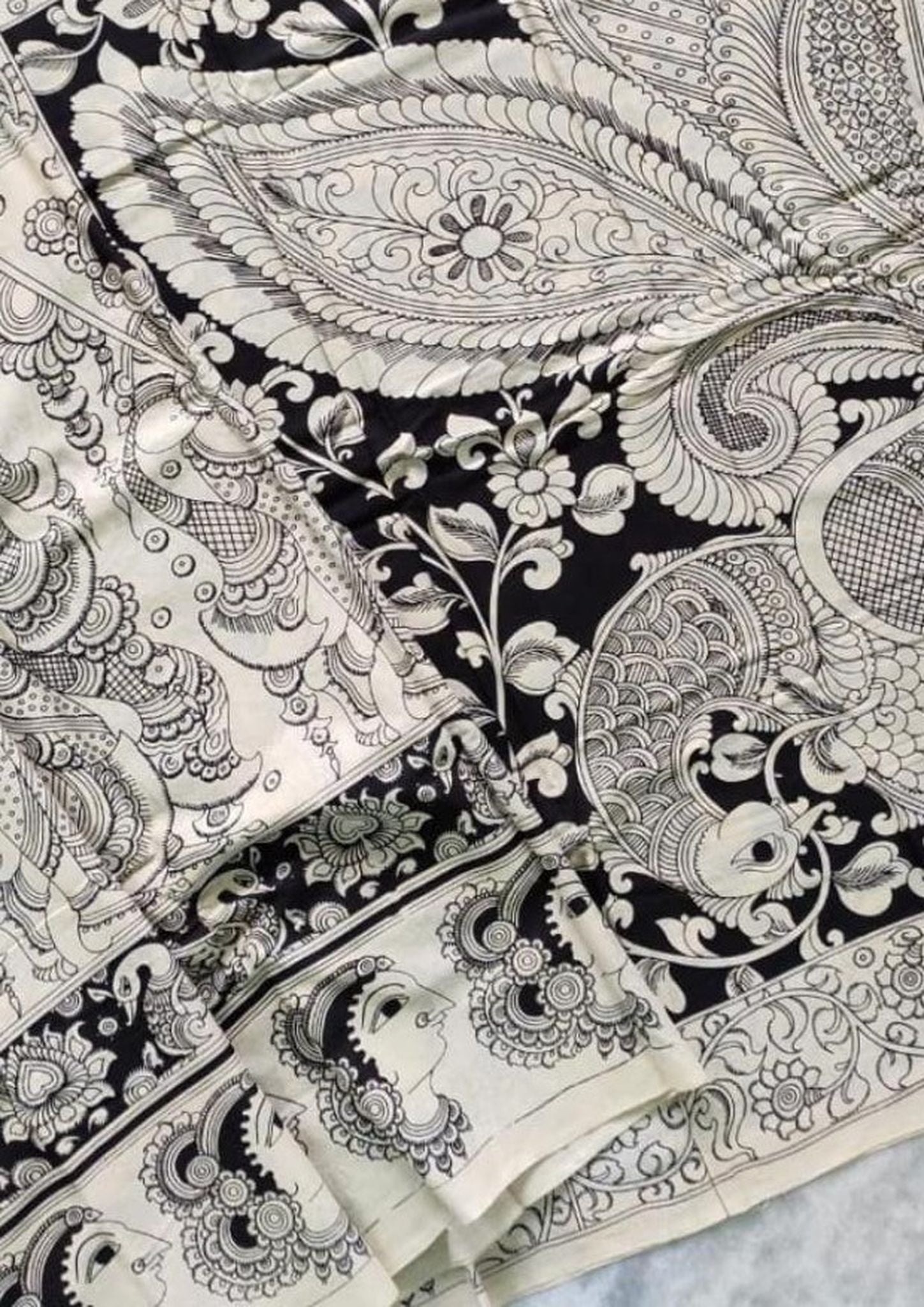 Kalamkari Chennuri Silk Black& white Hand Painted Sarees