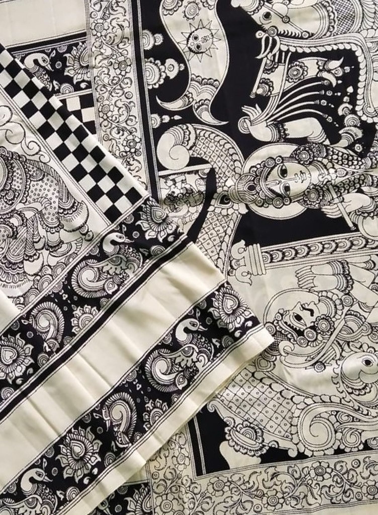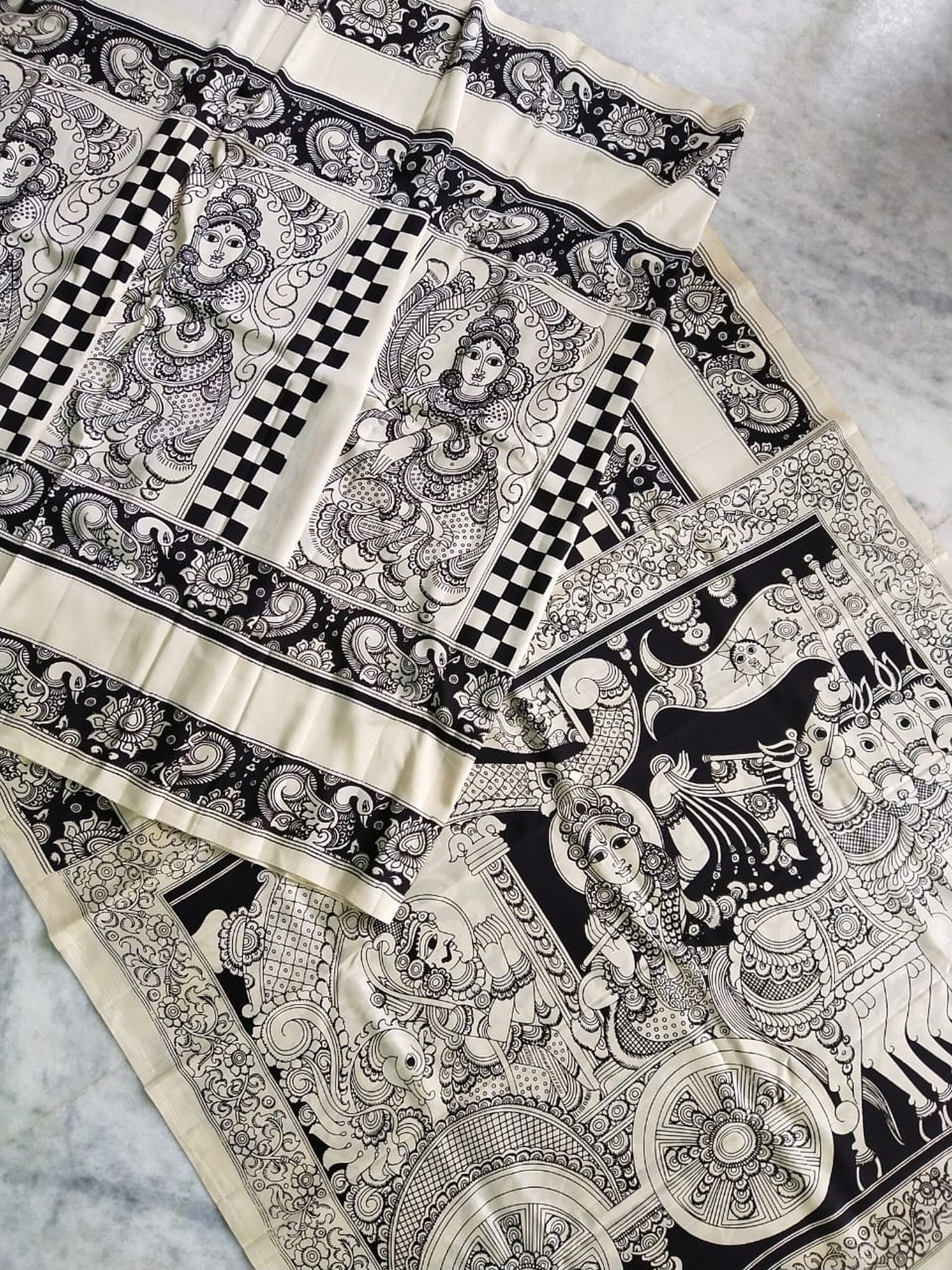 Kalamkari Chennuri Silk Black& white Hand Painted Sarees